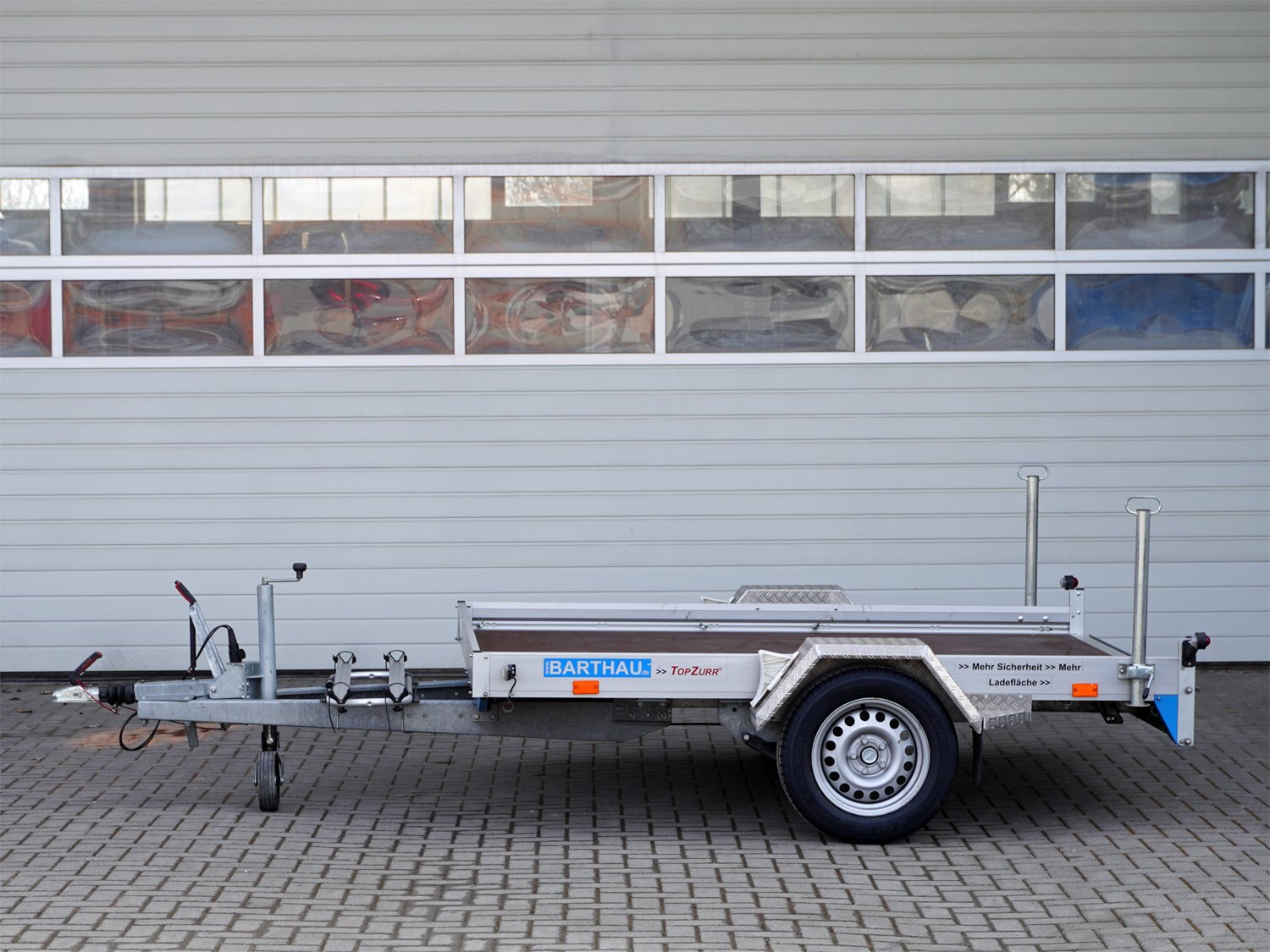 Der Barthau QM1351 ist ein hochwertiger Plattform-Anhänger mit Aluminium-Auffahrrampen, die eine griffige Lauffläche und seitlichen Schutzrand bieten. Dank der vollkommen geschraubten, verwindungsfreien Aluminiumrahmen-Konstruktion aus hochfester Speziallegierung bleibt der Anhänger besonders stabil.