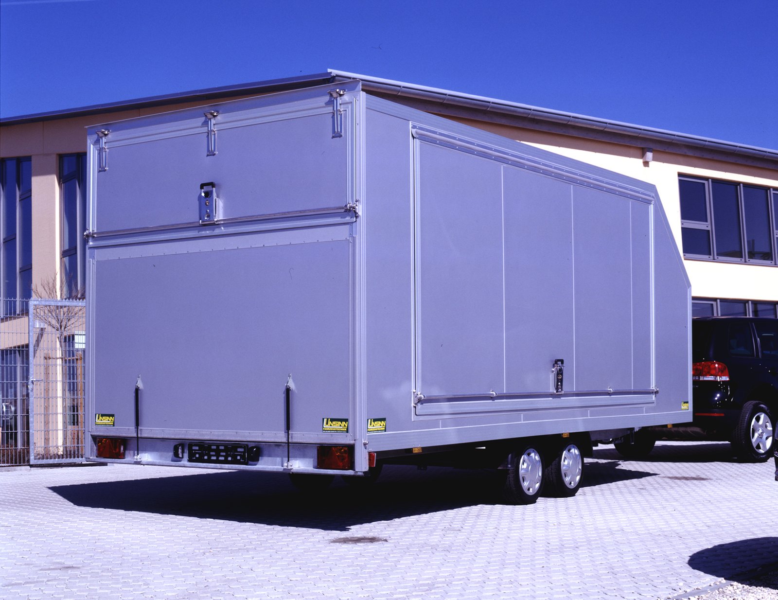 - Klappen: Stirnwandklappe (2300 x 600 mm), Seitenklappen (4000 x 1800 mm), Heckklappe mit Gasfederhubhilfe