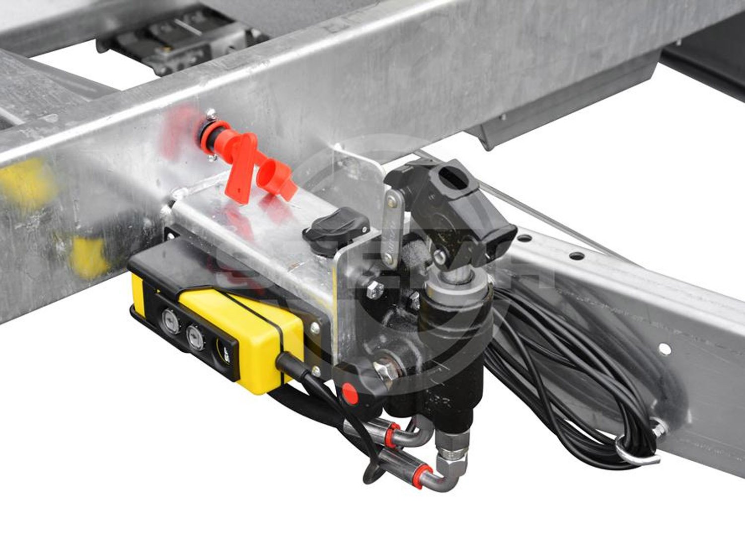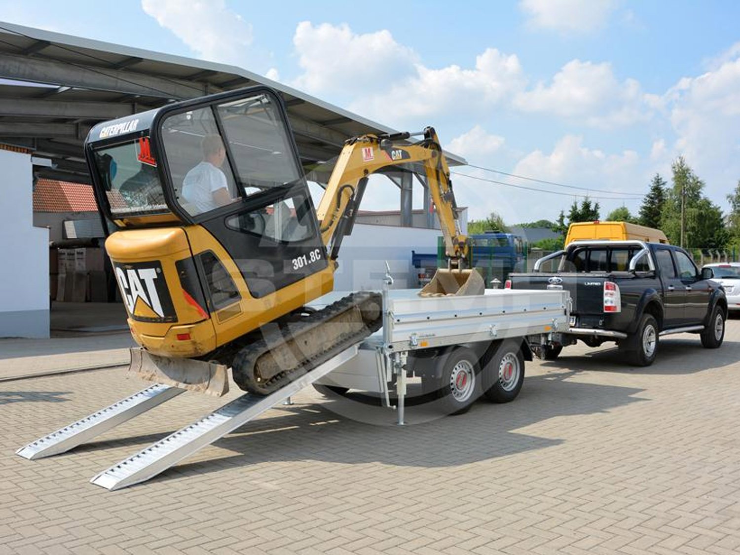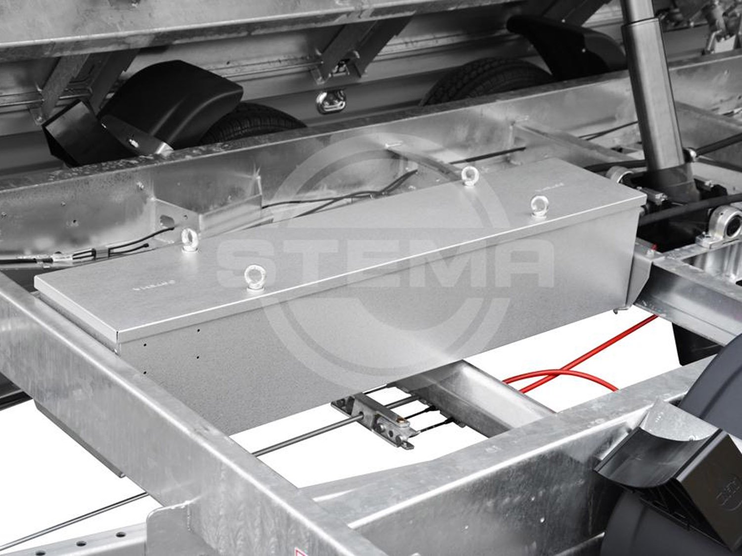 Der STEMA SHDK 35-36-20.2B TRIUS ALU ist ein Tandem-Hochlader mit einer V-Deichsel und Aluminium-Bordwänden. Er verfügt über eine Elektropumpe und einen hartverchromten 3-stufigen Teleskopzylinder für eine zuverlässige Kippfunktion. Der Grundrahmen (Fahrgestell) und die Kippbrücke bestehen aus massiven, verschweißten Stahlprofilen und sind vollständig im Tauchbad feuerverzinkt für maximale Langlebigkeit. Die Ladefläche besteht aus verzinktem Stahlblech und ist mit drei zusätzlichen Längsträgern ausgestattet, um eine optimale Lastverteilung zu gewährleisten. Bis zu acht versenkte Schwerlast-Zurringe (Zugkraft je 800 daN, DEKRA geprüft) sind im Brückenboden montiert, und die Bordwände sind allseitig abklapp- und abnehmbar. Die pendelbare Rückwand mit erhöhten Eckrungen ermöglicht eine größere Durchgangshöhe beim Entladen. Zur Ausstattung gehören zudem eine Auflaufbremse, ein Automatik-Stützrad, eine moderne Multifunktionsbeleuchtung mit Rückfahrscheinwerfer, zwei Unterlegkeile mit Halterung und eine Service-Stütze für zusätzliche Stabilität.
