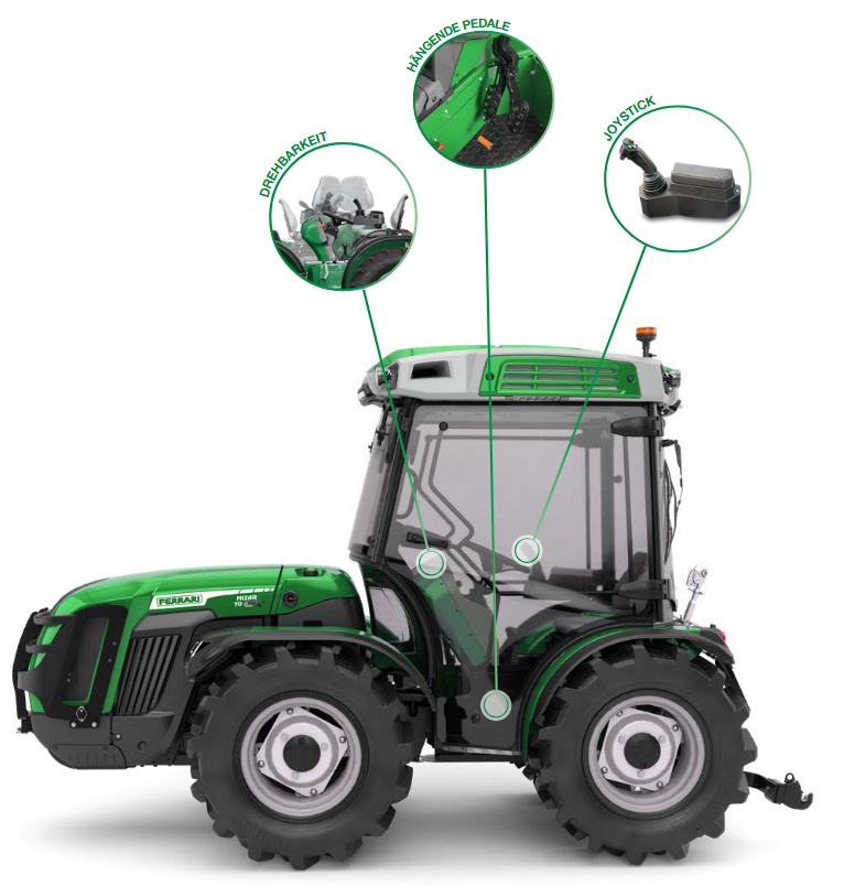 Der vielseitige Mizar 70 AR von Ferrari ist kompakt, hochmanövrierbar und liefert trotzdem erstklassige Leistung und Zuverlässigkeit, wie man sie von einem Profi-Traktor erwartet. Mit seiner schmalen Spur, der isodiametrischen Bauweise und Knicklenkung glänzt er auf engem Raum ebenso wie auf schwierigem Gelände.
