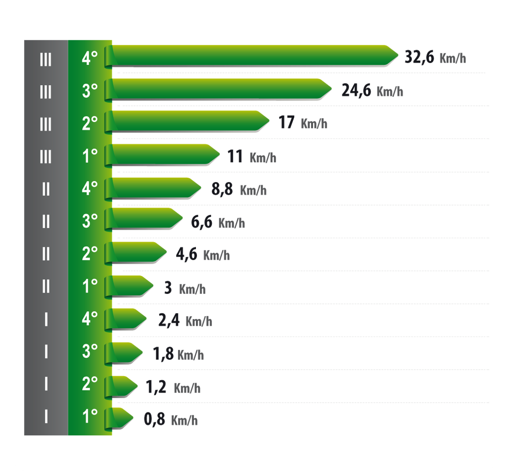 Traktor mit Standard-Untersetzungsgetrieben und Reifen: 320/65 R18 – 250/80 R18 – 280/70 R18 – 260/70 R20 |